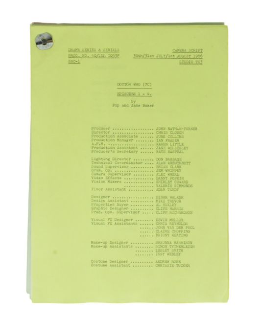 Doctor Who - Trial Of A Timelord (Terror Of The Vervoids) - Sixth Doctor (Colin Baker) era - original production used camera script for 'Episodes 1-4'. Dated July/August 1986. 199pp on yellow, green, white and pink paper. Original pin to corner. Features all the dialogue and scenes listed for shooting between 30th July and 1st August. Used, but generally in excellent condition.