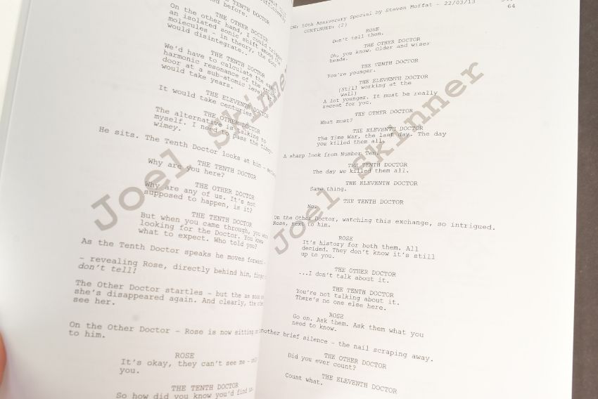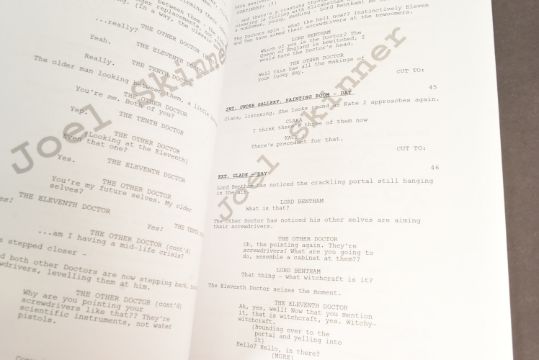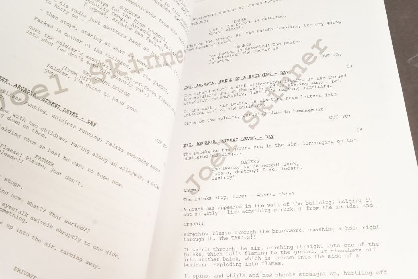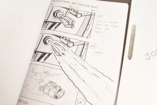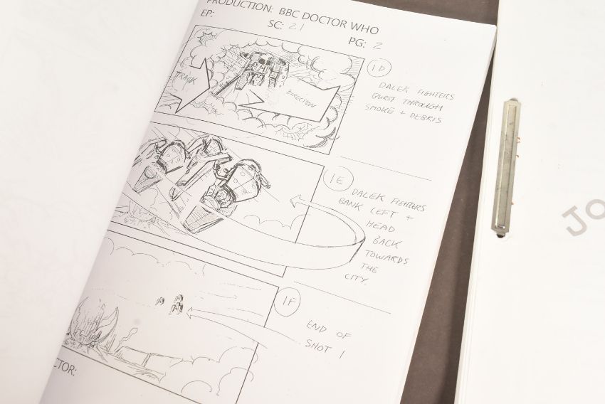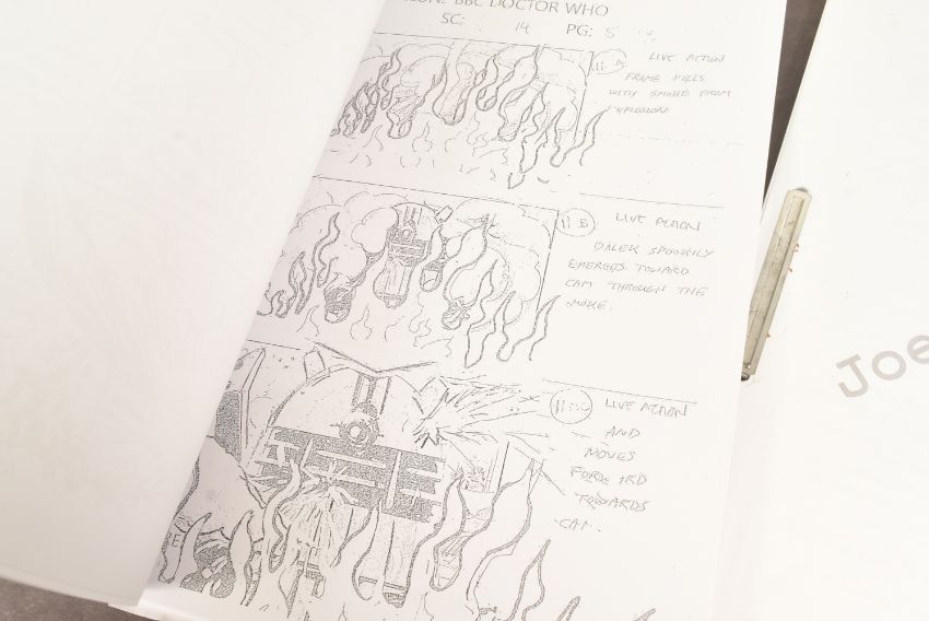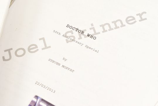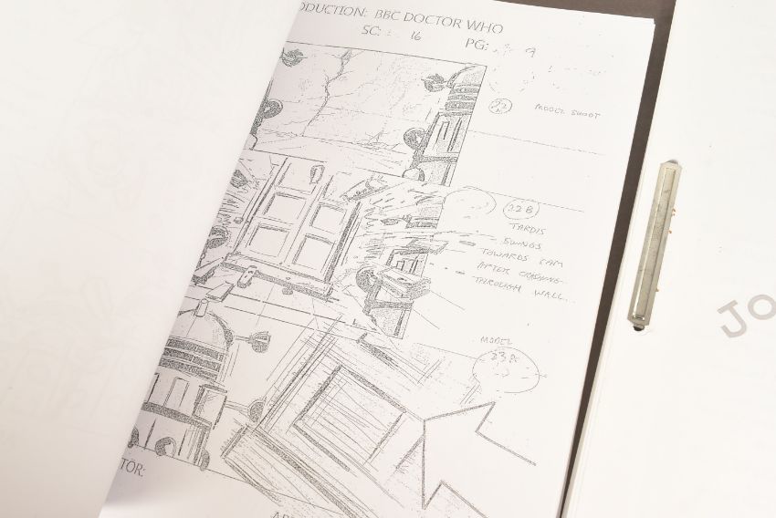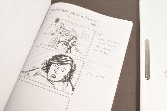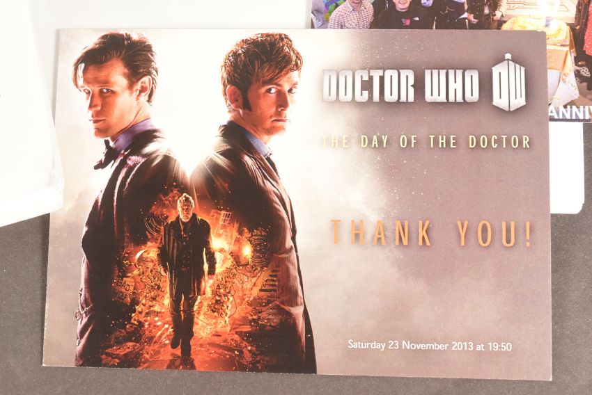 Doctor Who (BBC sci-fi series 1963 to present) - The Day Of The Doctor (2013 50th Anniversary special episode) - collection of production used items to include: a complete printed VFX storyboard document showing the majority of shots that require SFX work, which includes scenes of Gallifrey, multiple versions of the TARDIS flying and being plucked from the sky, scenes in the barn, 120+pp on white stock. With original metal fastener. Also included is a full draft script dated 22.03.2013, 91pp double-sided on white stock, with original fastener to corner. Along with an official crew 'Day Of The Doctor' 'Thank You' card from Matt Smith (with a note in his hand to the rear), and a crew-only photograph 'Doctor Who 50th Anniversary 2013' cast and crew photograph. From a member of the VFX crew. (4)
