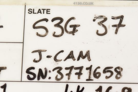 His Dark Materials - The Amber Spyglass (2019-2022 BBC adaptation based on the Philip Pullman novels of the same name) - an original production used clapperboard plastic slate. Filled out in dry-wipe marker with details of the shot last used, with 'Badwolf' production logo to the right-hand edge and custom-made Dark Materials artwork to the lower edge, noting the director and director of photography for production. Measures approx 19cm x 28cm.