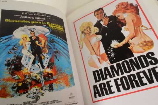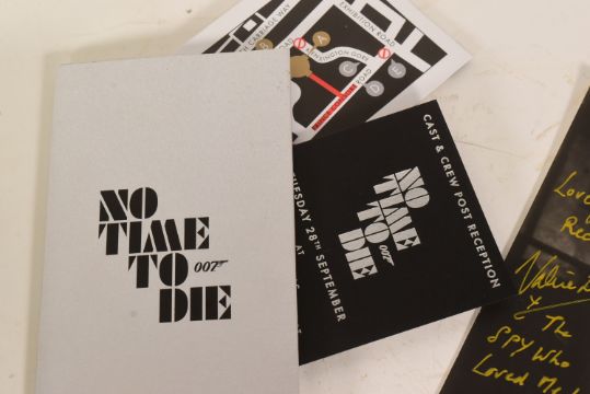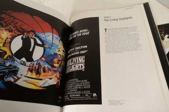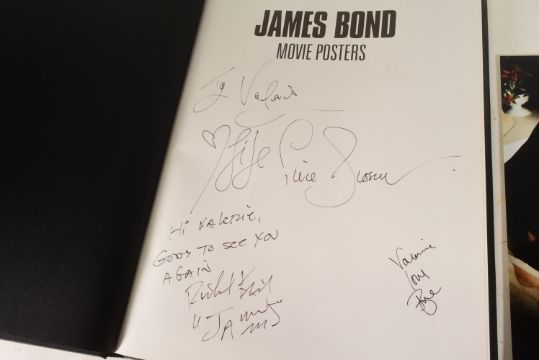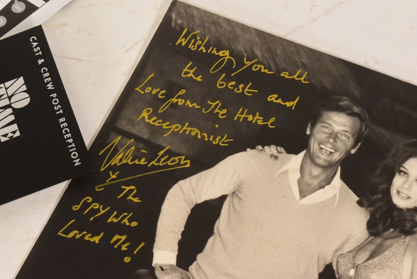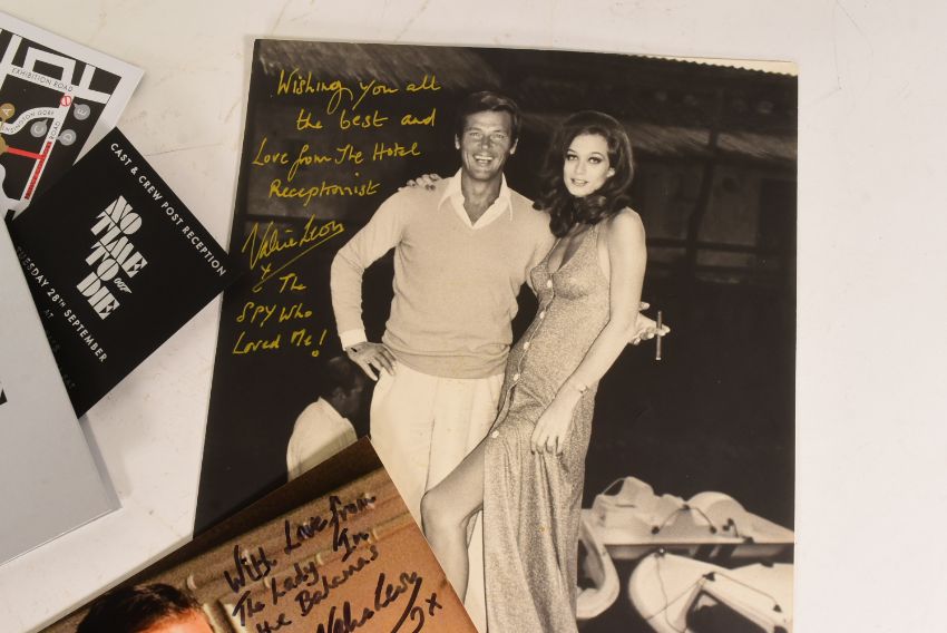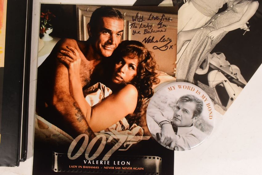 James Bond 007 - a collection of items from Valerie Leon's personal collection to include: 'The Official 007 Collection of James Bond Movie Posters' book signed to the title page by Pierce Brosnan, Richard Kiel (d.2014) and a third autograph believed to be that of Roger Moore (signed 'Roger'), all dedicated 'To Valerie,' a promotional Roger Moore 'My Word Is My Bond' large pin badge, Leon's invitation to the premiere and after-show party of No Time To Die at the Royal Albert Hall, and two signed photographs of Leon from her Bond Girl roles - The Spy Who Loved Me alongside Roger Moore and Never Say Never Again alongside Sean Connery. All from Leon's personal collection.