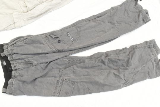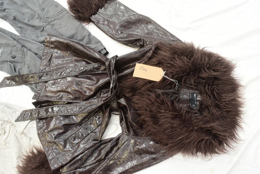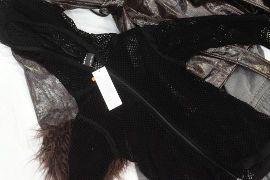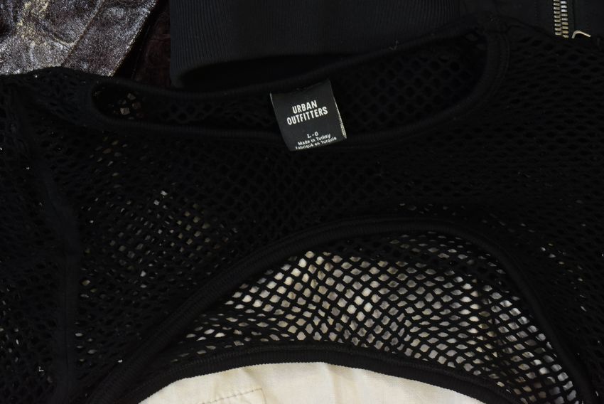 The Outlaws (2021-2024 TV Series by Elgin James & Stephen Merchant) - a collection of original production and screen used clothing from the series, likely mostly Season 3. Includes: an Asos Design leather style jacket marked for 'Rhe' (likely Rhianne Barreto, Rani in the series), two fishnet ladies' tops, pairs of trousers and a black and orange bomber style jacket. Some appear used, others likely 'as new' production spares. All as used during production on the series.