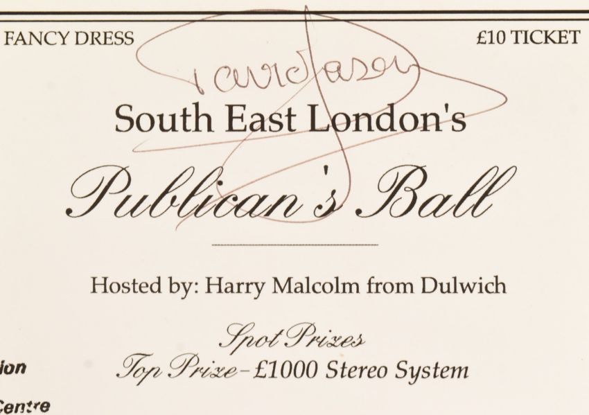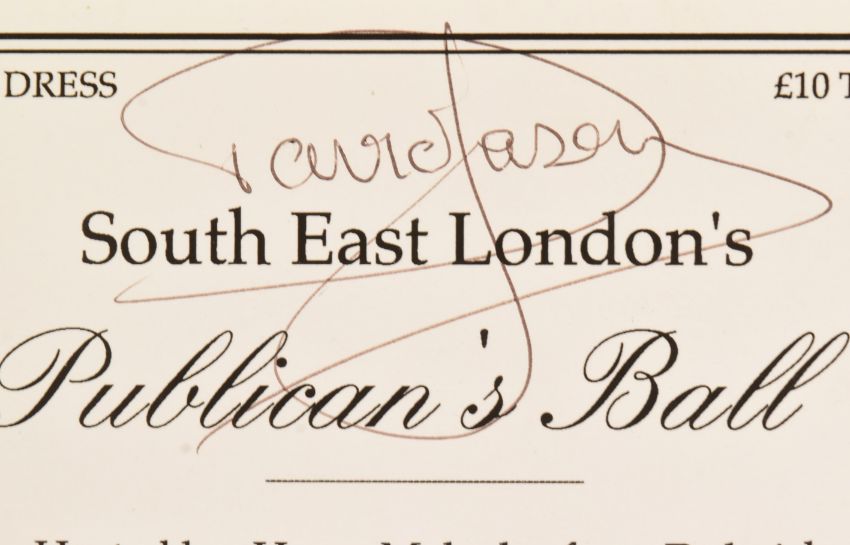 Only Fools & Horses (BBC Sitcom 1981-2003) - Heroes And Villains (1996 Christmas Special) - an original screen used prop ticket for the 'South East London Publican's Ball'. Printed on white card, with black text. Signed to the front by Sir David Jason (Del) in black ink, undedicated. 10cm x 15cm.The ticket represents a crucial part of the plot for the classic episode, known for it's scene in which Del and Rodney break down whilst dressed as Batman and Robin. It is to this very Publican's Ball that they arrive whilst dressed as the iconic duo. Supplied with a certificate of authenticity from the Only Fools & Horses Appreciation Society.