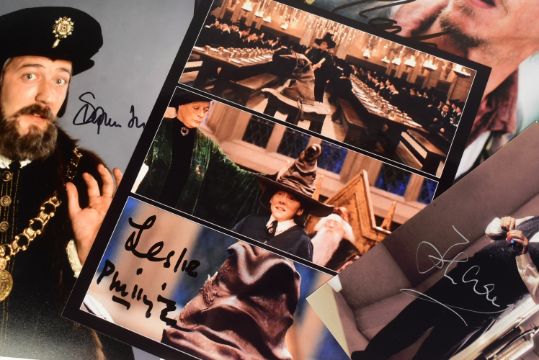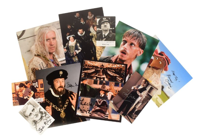 British Comedy - a collection of x10 assorted signed photographs relating to various British comedy shows or actors. Includes: Tony Robinson, Stephen Fry, Bernard Cribbins, Leslie Phillips (Harry Potter photo), Rhys Ifans, John Cleese, Stephen Lewis (vintage LWT On The Buses photo), Reg Varney, Spike Milligan and Mackenzie Crook. Most accompanied by certificates of authenticity from an AFTAL approved dealer. Various sizes.