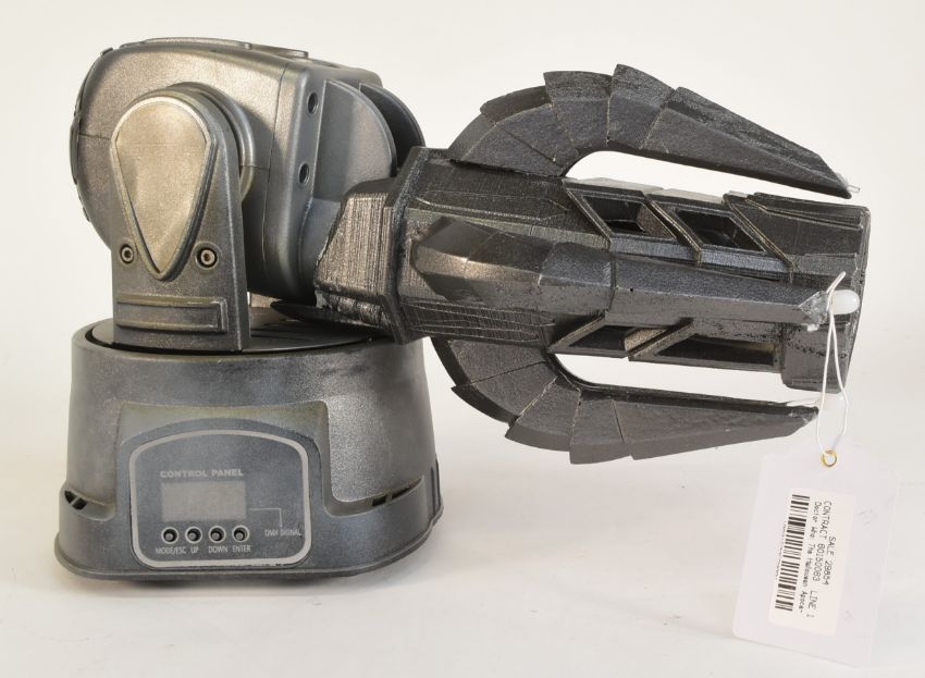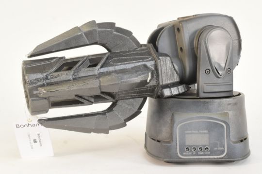 Doctor Who (Thirteenth Doctor era) - The Halloween Apocalypse - screen used prop from Karvanista's security weapons system. Moulded and painted foam construction, with four fibre-optic type lights to the end of each section. The custom-made end piece mounted atop a theatrical light which would have allowed it to be fully controlled on set. Weapons like this can be seen throughout the episode, mounted upon the walls. Some wear from production use. Measures 35cm x 23cm x 18cm, approx. Ex Bonhams 12th June 2024.Please view 'Important Sale Information' regarding electrical items.