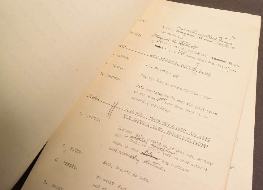 The Goon Show (BBC Radio Comedy Programme 1951-1960 starring Spike Milligan, Harry Secombe and Peter Sellers) – an original recording script owned and used by producer John Browell for Series 9, Programme 12 ‘The Call Of The West’. The script is well annotated throughout in Browell’s hand, with stage directions, altered lines, and general notes taken during recording. His name ‘John’ is noted to the cover page. 29pp, plus cover. Some loose pages. With original RX / transmission details sheet. (2)
