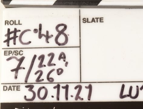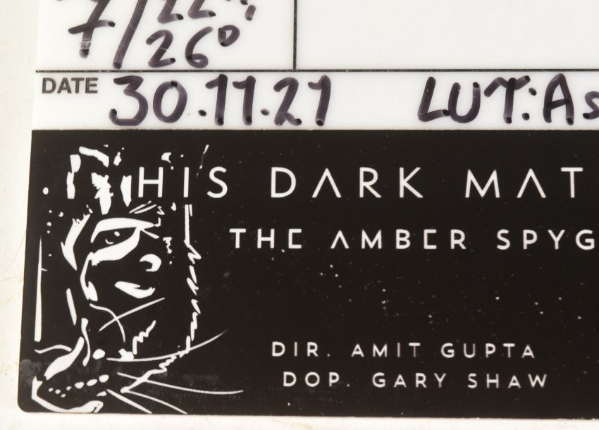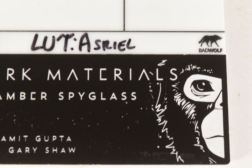 His Dark Materials - The Amber Spyglass (2019-2022, Series Three, BBC adaptation based on the Philip Pullman novels of the same name) - an original production used small clapperboard. Filled out in dry-wipe marker with details of the shot last used, with 'Badwolf' production logo to the right-hand edge and custom-made Dark Materials artwork to the lower edge, noting the director and director of photography for production. Smaller sized, used for closeup shots. Measures approx: 17cm x 19cm.