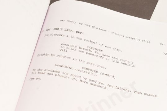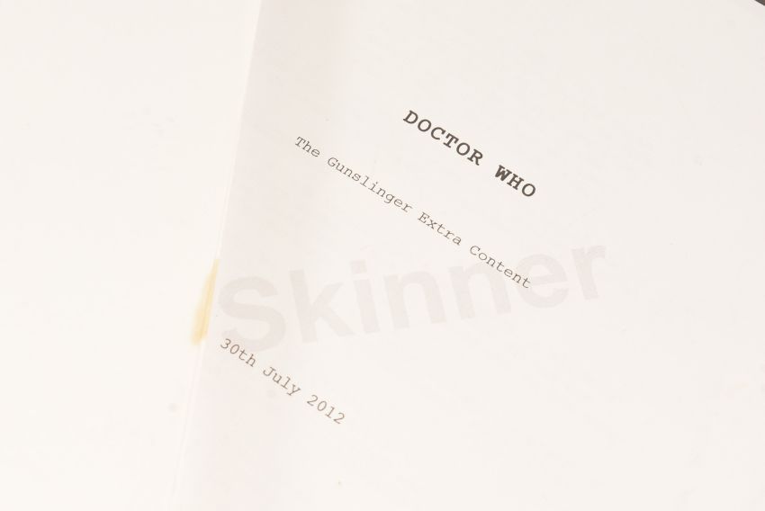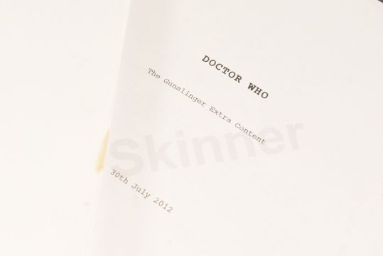 Doctor Who (BBC sci-fi series 1963 to present) - A Town Called Mercy (2012 Eleventh Doctor era) - original production used full shooting script dated 20th February 2012 carrying the working title 'Mercy'. 112pp on white stock, with original metal fastner. Along with an original production script for the webcast episode available online prior to this episode, named as 'The Gunslinger Extra Content' and dated 30th July 2013. 3pp, stapled to corner, first page torn. From a member of the VFX crew. (2)