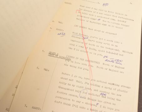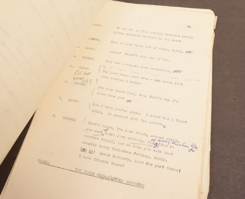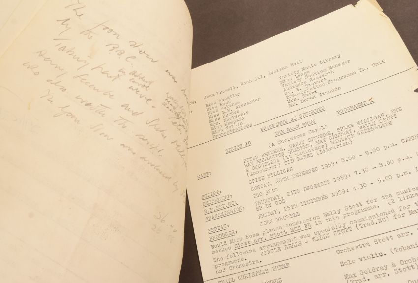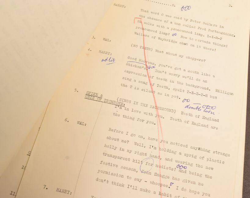 The Goon Show (BBC Radio Comedy Programme 1951-1960 starring Spike Milligan, Harry Secombe and Peter Sellers) – an original recording script owned and used by producer John Browell for Series 10, Programme 1 ‘A Christmas Carol’. The script is well annotated throughout in Browell’s hand, with stage directions, altered lines, and general notes taken during recording. His name ‘John’ is noted to the cover page. 30pp, plus cover. With three original RX / transmission details sheet, and housed in a card folder with broadcast date noted. (4)