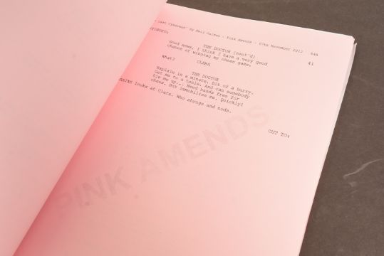 Doctor Who (BBC sci-fi series 1963 to present) - Nightmare In Silver (2013 Eleventh Doctor era) - original production used shooting script dated 06.11.2012, with the working title 'The Last Cyberman'. 100pp on white and pink pages, complete. From a member of the VFX crew.