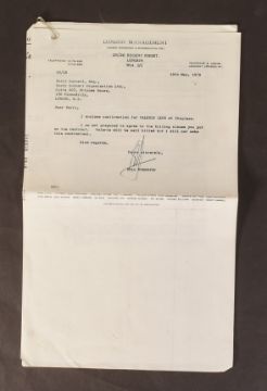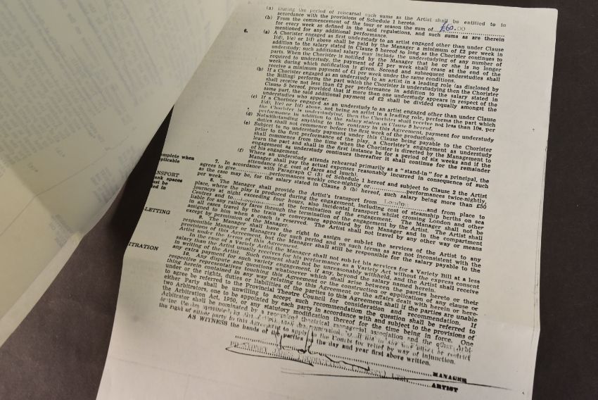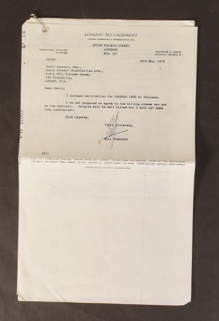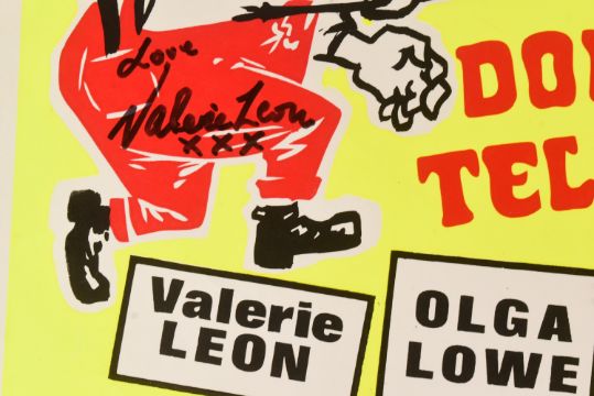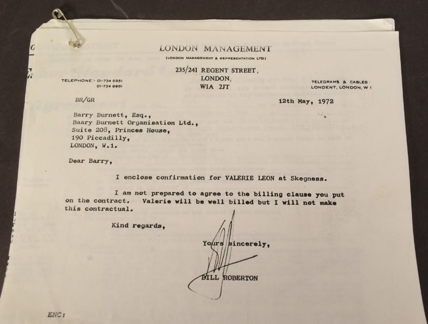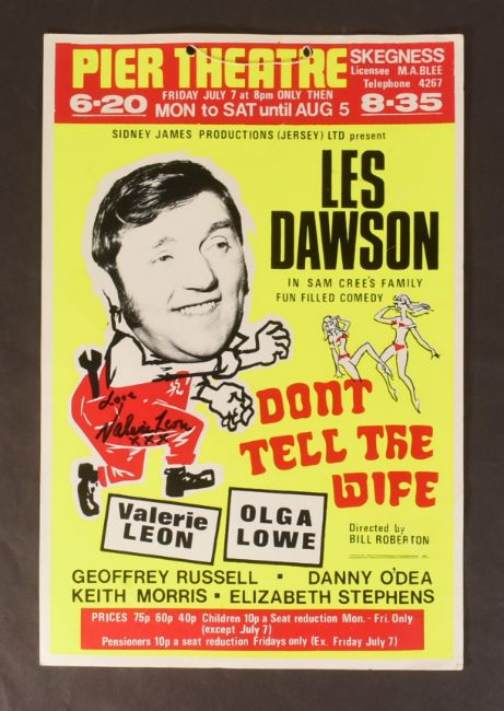 Don't Tell The Wife (1972 Stage Show) - a collection of items from the stage show, performed at the Pier Theatre, Skegness in 1972 starring Les Dawson, Valerie Leon and Olga Lowe. Includes: an original theatre window showcard / poster signed by Leon in black ink, and Leon's copy of the contract for her role. Affixed to the contract is a letter from London Management discussing her billing on the poster. Showcard measures approx: 38cm x 25cm. From Valerie Leon's personal collection.