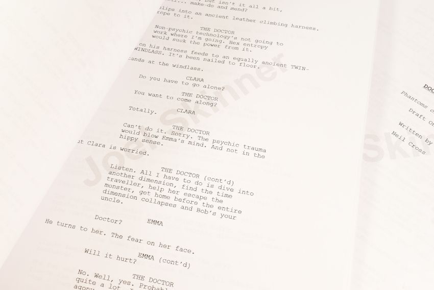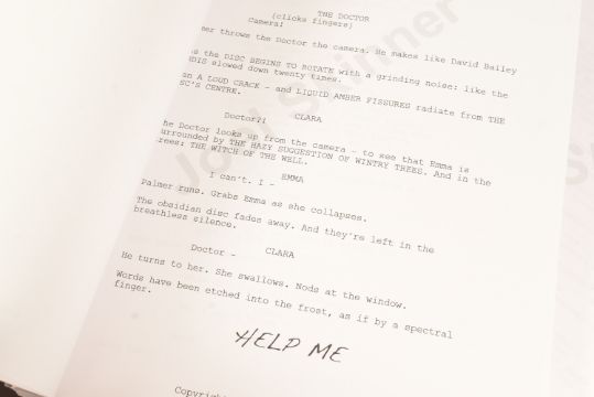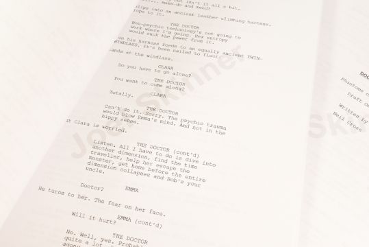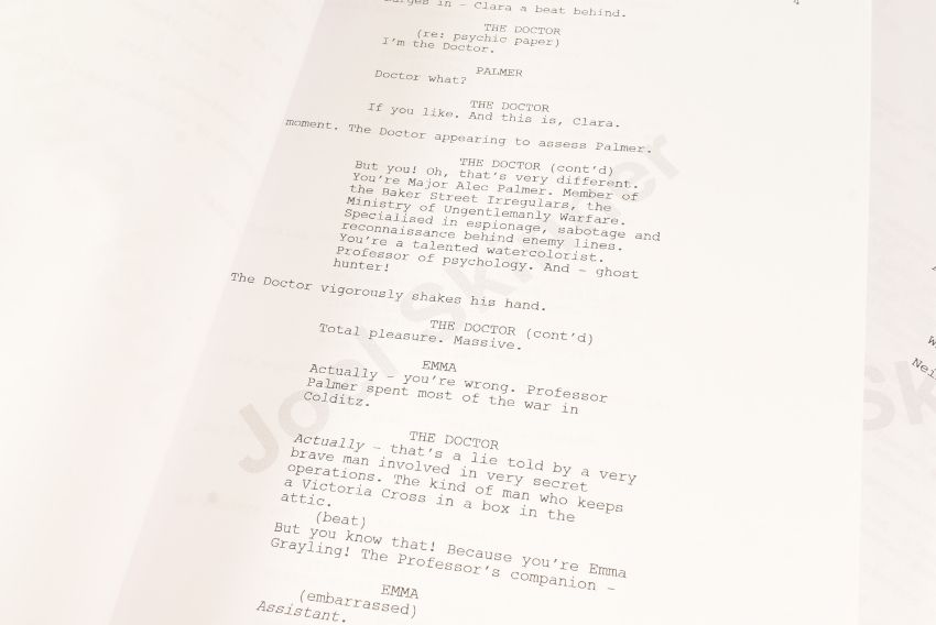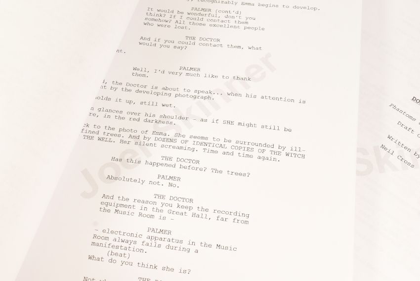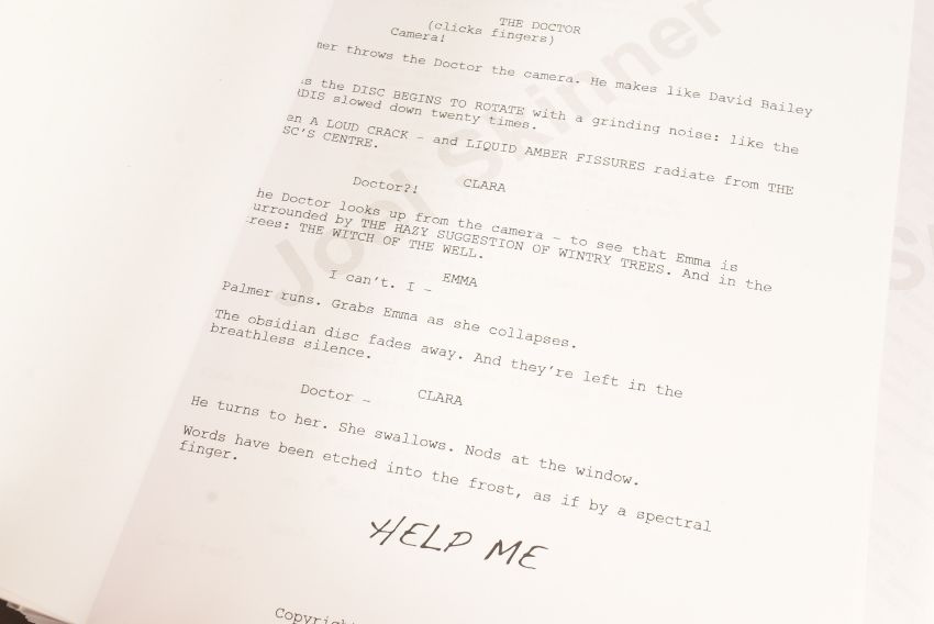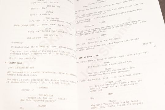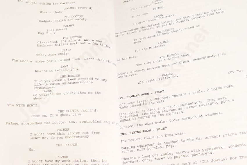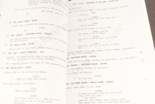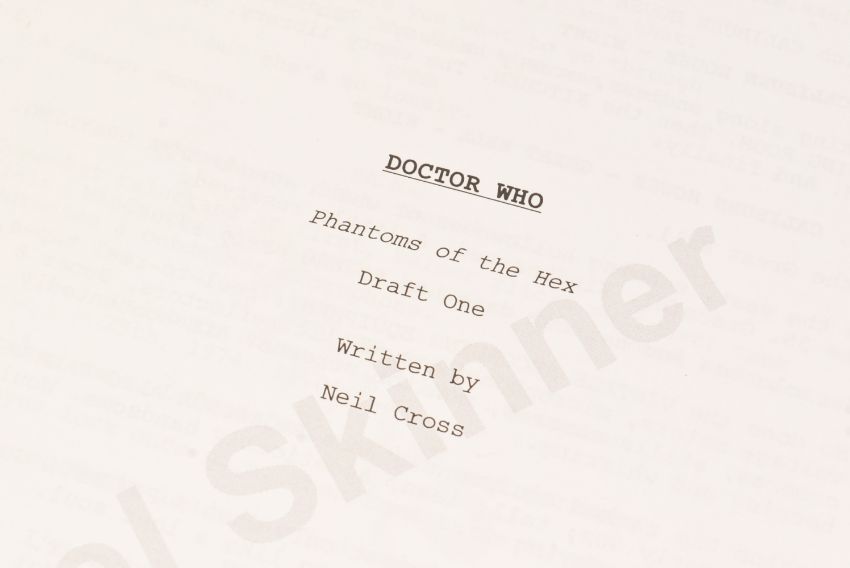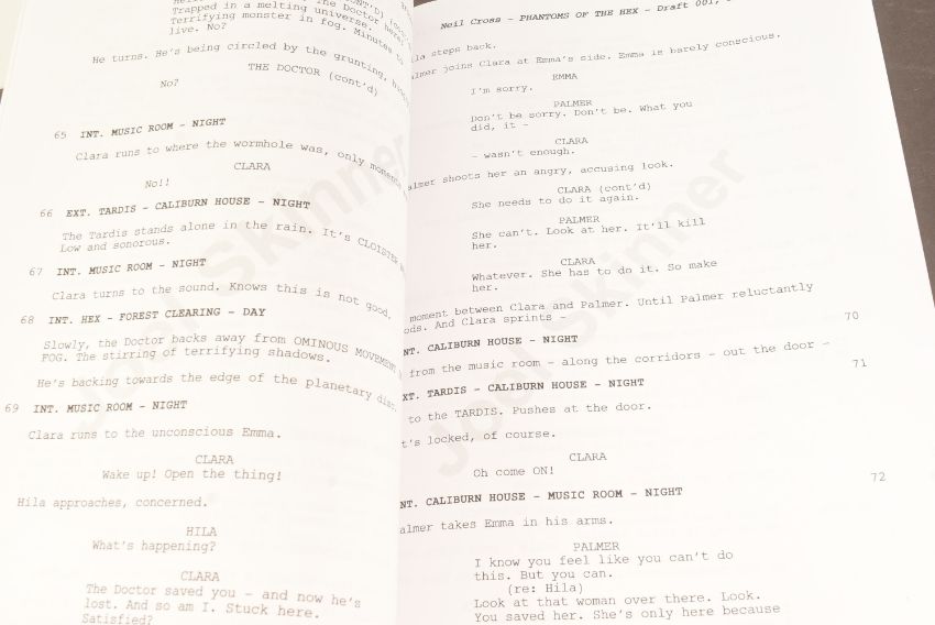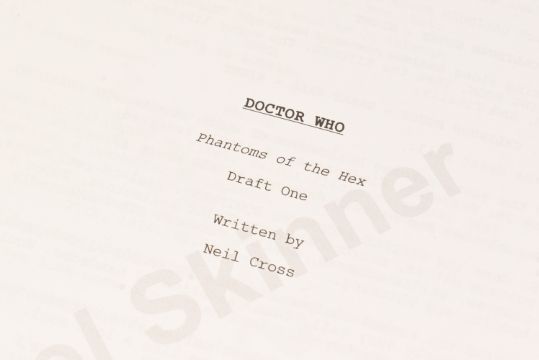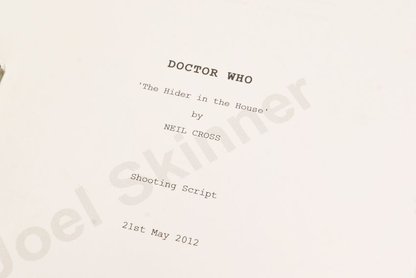 Doctor Who (BBC sci-fi series 1963 to present) - Hide (2013 Eleventh Doctor era) - original production used full shooting script dated 21st May 2012 carrying the working title 'The Hider In The House'. 130pp on white stock. Retains original metal fastner. Along with an earlier draft (dated 2010) for the same episode, this time under the title 'Phantoms Of The Hex' being 56pp double-sided. From a member of the VFX crew. (2)