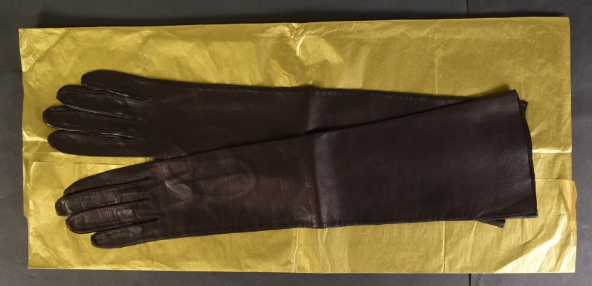 Suzanna Leigh (1945-2017) - British-born Actress - a pair of vintage evening gloves personally owned and worn by Leigh at The Royal Film Performance of Born Free (1966). The charity screening event took place at the Odeon Theatre in Leicester Square, London, in 1966. Queen Elizabeth II was in attendance and met many of those present afterwards including Raquel Welch, Woody Allen, Ursula Andress and Suzanna Leigh. These French leather gloves featured as part of a specifically-designed outfit for Leigh, and are accompanied by the original watercolour sketches by designer Alan Sievewright. The gloves retain the gold tissue paper in which they were wrapped for many years. They survive in excellent original condition.Accompanied by a full letter of provenance from Natalia Leigh, Suzanna's daughter. Also included is a signed 8x10" photograph of Leigh depicting her in the lineup ready to meet The Queen, where these gloves are visible. A unique selection of memorabilia from Leigh's personal collection.Suzanna Leigh (1945 - 2017) was a British actress, known for her film and television roles in the 1960s and 1970s. Her film roles include the love interest of Elvis Presley in Paradise, Hawaiian Style (1966), a stewardess in the comedy Boeing Boeing (1965), and the heroine in a some Hammer films - The Lost Continent (1968) and Lust for a Vampire (1971). She also starred in the cult British horror films The Deadly Bees (1966) and The Fiend (1972). In 1974 she starred as Amber in Son of Dracula. She wrote a 2000 autobiography, Paradise, Suzanna Style.