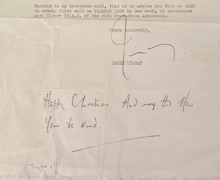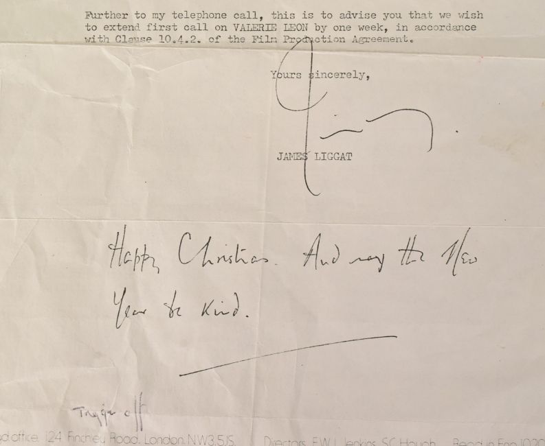 Revenge Of The Pink Panther (1978 British Comedy film starring Peter Sellers) - a period copy of an original production letter sent to Valerie Leon extending her contract by a week. The letter was sent to Leon's agent, who then copied it and forwarded it to her. Dated 22nd December 1977. Filming had to be delayed briefly as Sellers became ill during production. Along with a vintage large format 11x15" publicity photograph of Leon as Tanya the Lotus Eater from the movie. Signed in black ink to a light area. Photographer's stamp to rear. From Valerie Leon's personal collection.