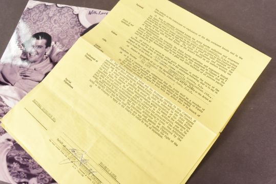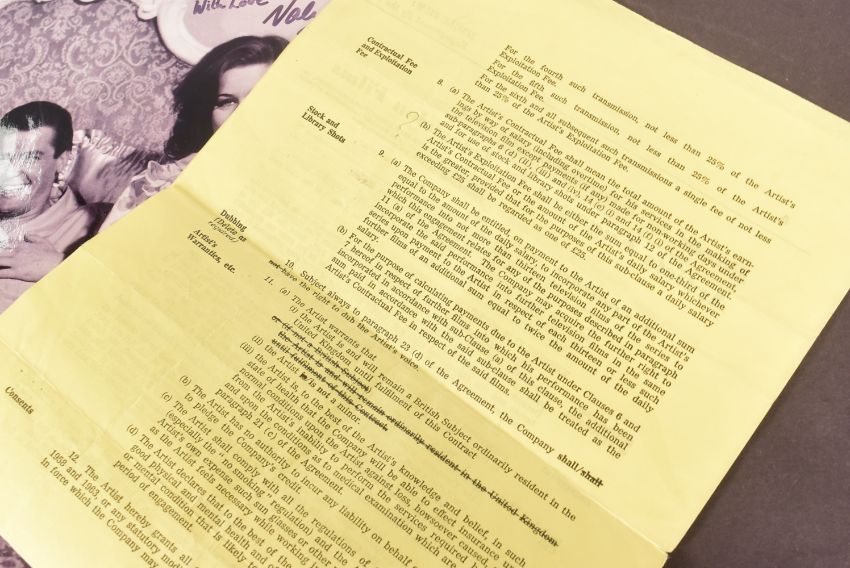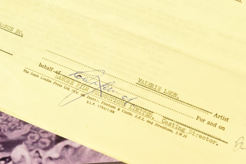 The Saint (British crime television series 1962-1969 starring Roger Moore) - Valerie Leon's original contract for the role of Therese in the episode 'To Kill A Saint'. Dated 14th December 1966 between Bamore Film Productions Limited and Valerie Leon. Leon was paid £15 per day, for a planned period of one day. Signed to the rear by casting director Robert Lennard. Measures 58cm x 23cm, approx. Along with an autographed 8x10" black and white photograph of Leon alongside Roger Moore in the episode. Signed by Leon in black ink. Production material from the cult TV series is rare.
