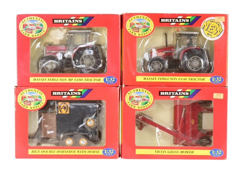 Diecast - x4 Britains made 1/32 scale diecast farm models comprising; Massey Ferguson 6140 Tractor, Vicon Grass Mower, Rice Double Horsebox with Horse and Massey Ferguson 6180 Tractor.