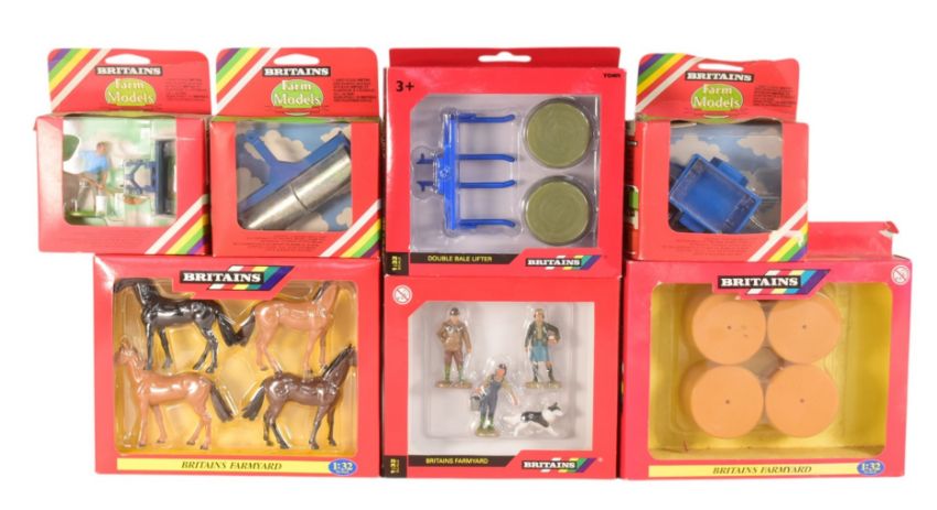 Diecast - a collection of x7 Britains made 1/32 scale diecast model farm equipment and figures to include; Farming Family and dog, Round Bales, Heavy Roller, Yard Scrapper, Horses and others.