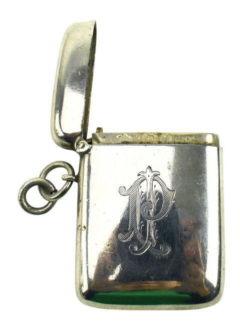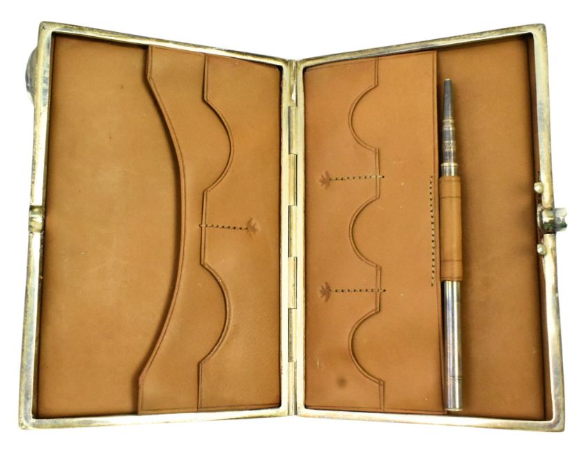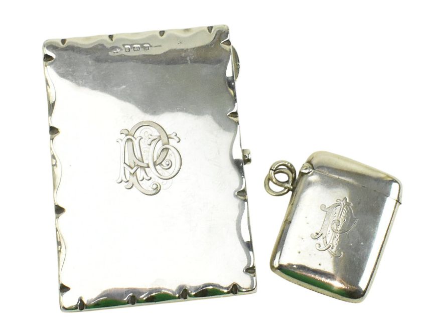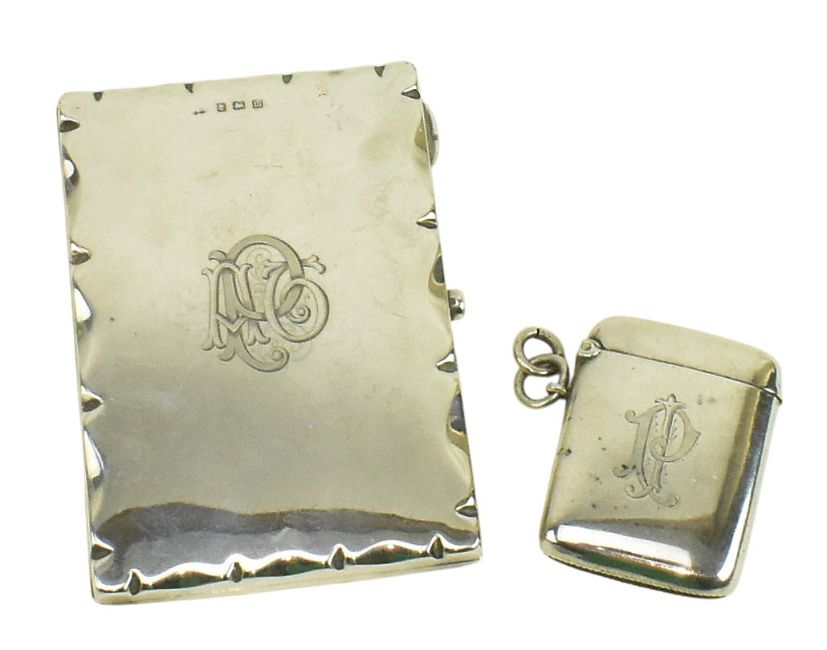 A George V hallmarked silver notebook case. The case lined with tan faux leather. Hallmarked year 1911, Birmingham. Maker's mark rubbed. Together with an Edward VII hallmarked silver vesta case. Hallmarked year 1905, Birmingham. Total gross weight approx. 172g.