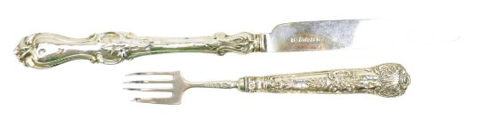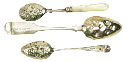 Two 19th century George III berry spoons and hallmarked silver flatware. The lot to include a large berry spoon. Hallmarked year 1808, Dublin. Sponsors mark for William Hamy. Together with a smaller hallmarked silver berry spoon. Hallmarked year 1795, London. Sponsors mark for W S. Further together with a George III hallmarked silver knife. Hallmarked year 1827, Sheffield. Sponsors mark for Aaron Hatfield & Sons. In addition, a hallmarked silver fork. Hallmarked year 1827, Birmingham. Sponsors mark for Joseph Willmore and a mother-of-pearl & hallmarked silver handled berry spoon. Hallmarked year 1909, Sheffield. Sponsors mark for John Round & Son Ltd. Total gross weight approx. 220g.