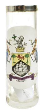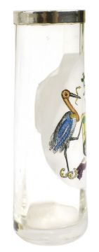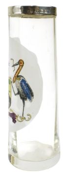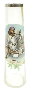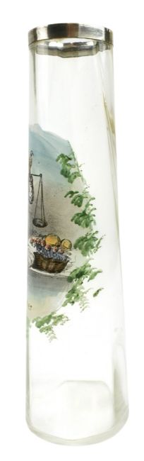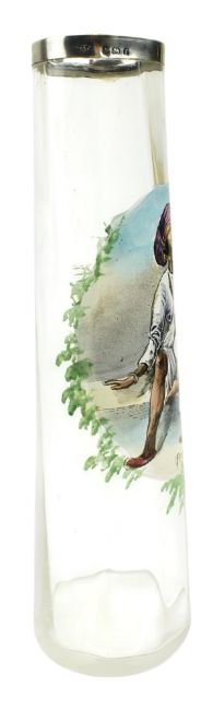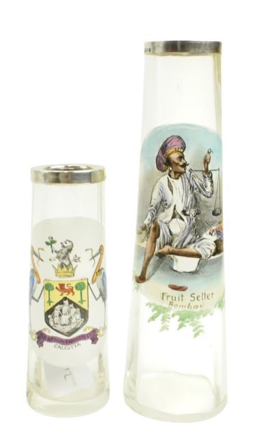 Two Edward VII hallmarked silver mounted & painted glass vases. Hallmarked year 1905, Birmingham. Sponsors mark for Marks & Cohen (Walter Henry Marks & Samuel Tobias Cohen). Each vase handpainted with Indian tourist scenes. Total gross weight 244.8g.