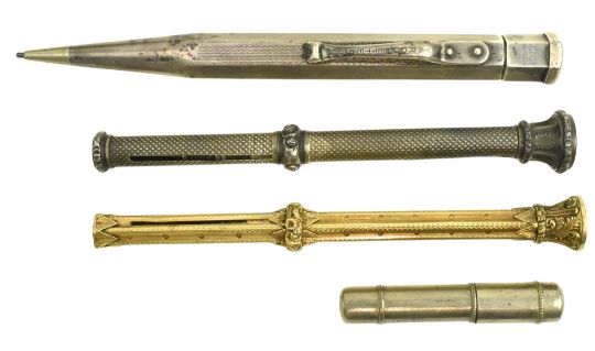 A gilded silver propelling pencil by S. Mordan & Co. Together with a silver propelling pencil by Yardolette. Hallmarked year 1950, London. Sponsors mark for Johnson, Matthey & Co. Further together with another silver propelling pencil. Total weight 44g.