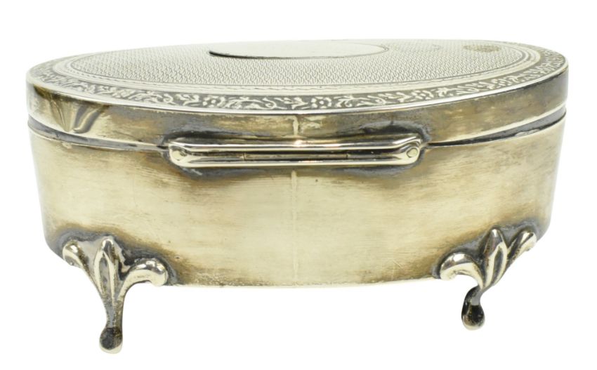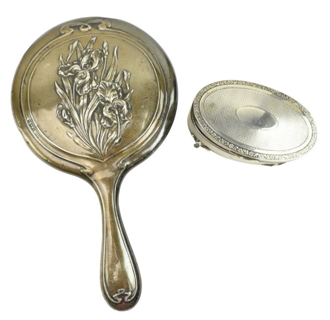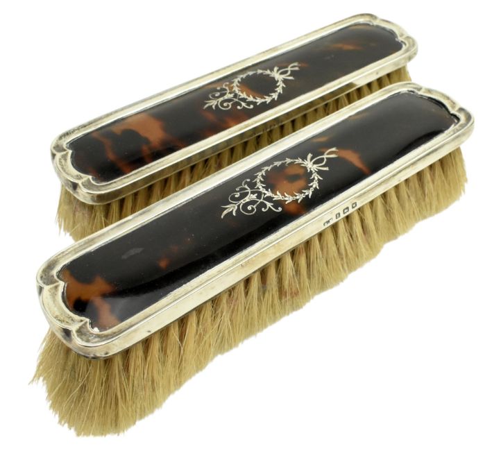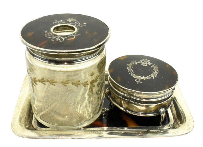 A George V hallmarked silver and tortoiseshell dressing table set. The set to include a mirror, two clothes brushes, a pin dish and a lidded trinket box. Hallmarked year 1919 to 1921, Chester / Birmingham / London. Sponsors mark for Henry Matthews & S. W. Goode & Co. Together with an Edward VII hallmarked silver hand mirror. Hallmarked year 1907, Birmingham. Sponsors mark for Henry Matthews. Further together with a George V hallmarked silver oval shaped lidded trinket box. Hallmarked year 1919, Birmingham. Sponsors mark for F R Gomm. Total gross weight approx. 1249g.