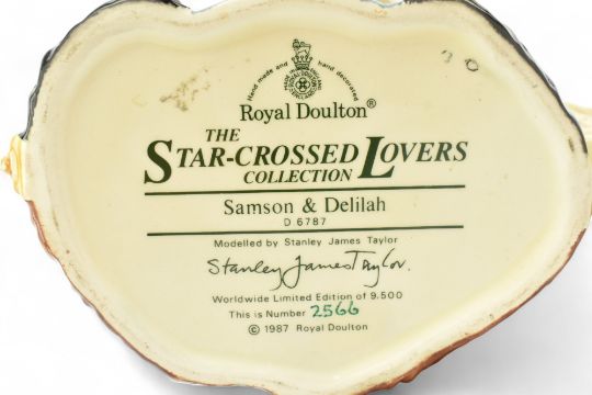 Royal Doulton - three ceramic character jugs. Comprising 1980 D 6661 Sherlock Holmes, 1993 D 6947 Captain Hook Character Jug of the Year 1994, and 1987 The Star Crossed Lovers D 6787 Samson and Delilah.