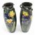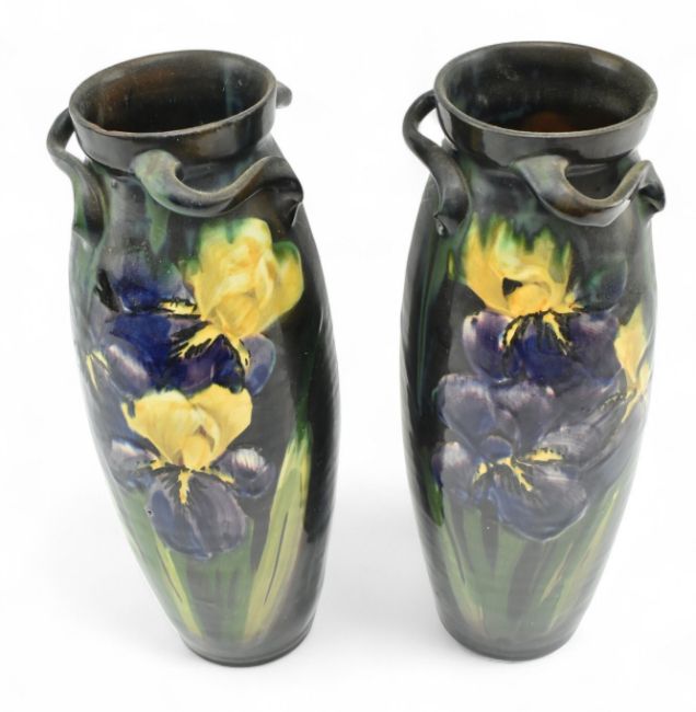 A pair of mid century lemon and crute Torquay Ware ceramic vases. Each vase with three twist handles & oviform body, with bottled black, blue & green ground. Central floral scenes of iris flowers. Incised signatures to bottom.