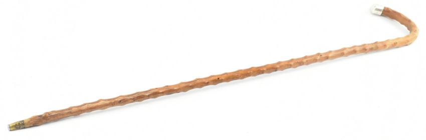 A vintage 20th century hawthorn & silver topped walking stick cane. The cane with knobbly body, featuring unhallmarked silver metal topped handle. Brass cap to end.
