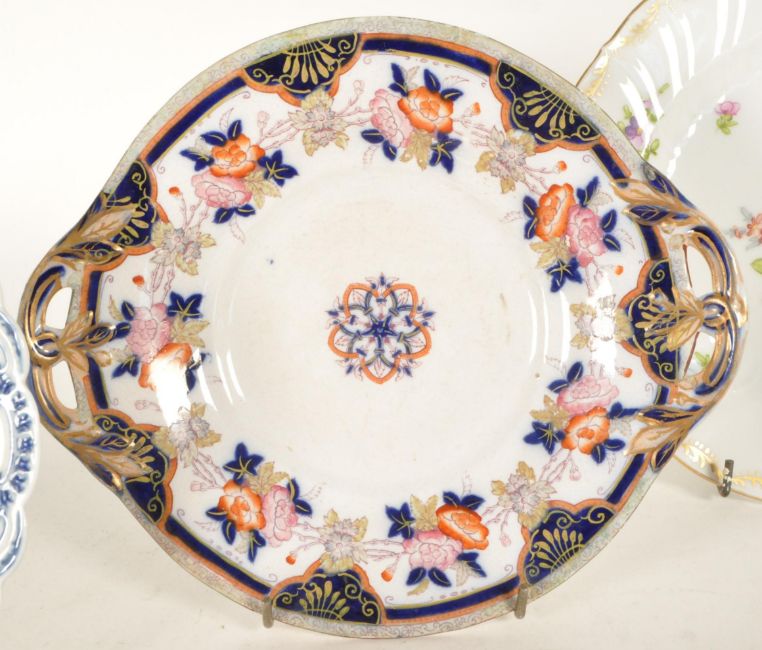Collection of 20th century china tea cups, saucers and plates. Comprised of two blue and white pierced Dresden plates, an ironstone imari twin handled plate, a Dresden plate decorated in hand painted floral motifs, a pair of Japanese blue and white tea cups and saucers, and a pair of unmarked pink and gilt tea cups and saucers. Largest plate measuring approx 22cm in diameter.