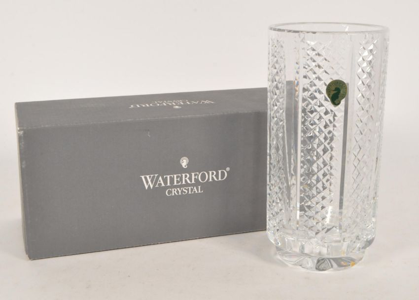 Waterford Crystal - 1995 boxed glass vase. Featuring crystal cut decoration and maker's sticker to body. Housed within the original box. Measuring approx. 20cm x 10cm without the box.
