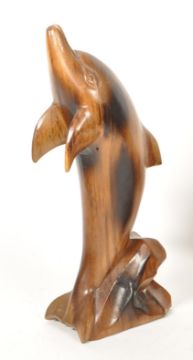 Two late 20th century contemporary carved wooden dolphin figures. One depicting two dolphins raised on a shaped base and another featuring a singular dolphin raised on a rock shaped base. Largest measuring approx. 24cm x 31cm x 16cm.
