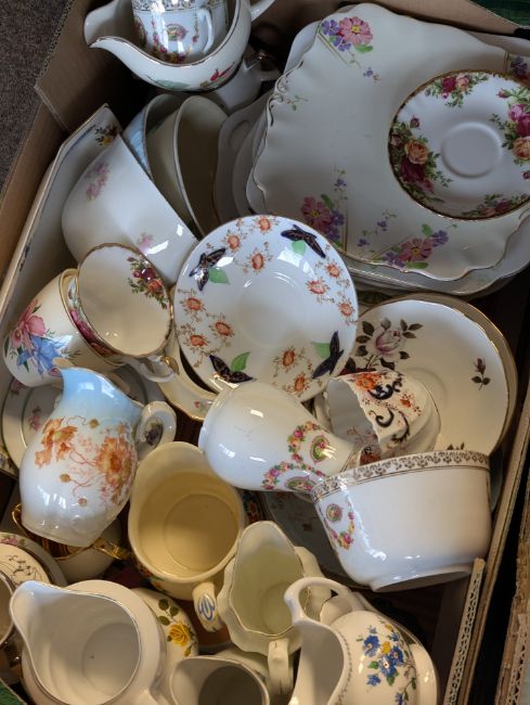 A large extensive mix and match collection of mostly English vintage 20th century porcelain bone china. Wedding pieces, tea rooms and porcelain hire. Including cups, sauces, jugs, side plates, serving plates etc. Brands include Royal Albert Old Country Roses, Crown Royal, Gainsborough, Staffordshire, Colclough and many other examples. Glass examples are also in. Over 100 pieces.