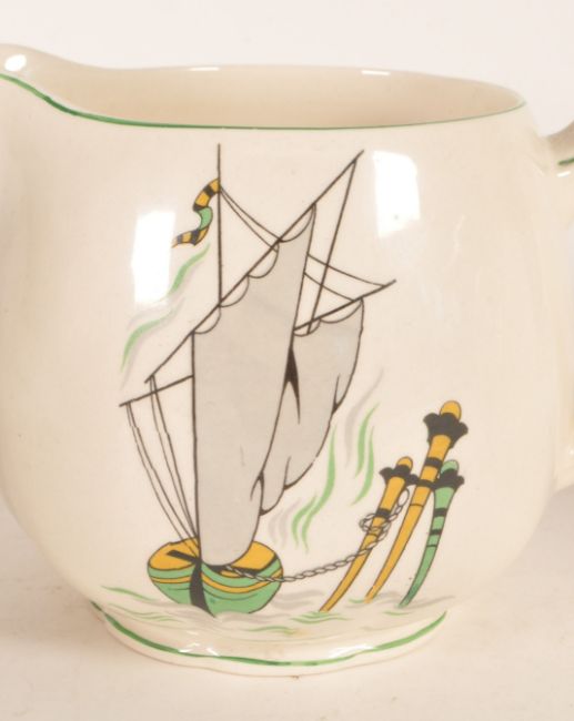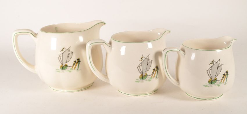 New Hall Pottery - Three graduating mid century 1950s earthenware Staffordshire jugs. Each decorated with sail boat transfer designs. Makers mark to the underside. Largest measuring approx. 13.5cm x 19cm.