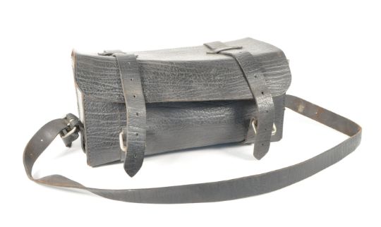 Early 20th century vintage black leather satchel / Doctor's bag. Featuring two straps able to be buckled to close and open the bag, revealing a spacious interior with one side compartment. Complete with adjustible leather strap and four metal studs to the underside. Measuring approx. 17cm x 38cm x 18cm.