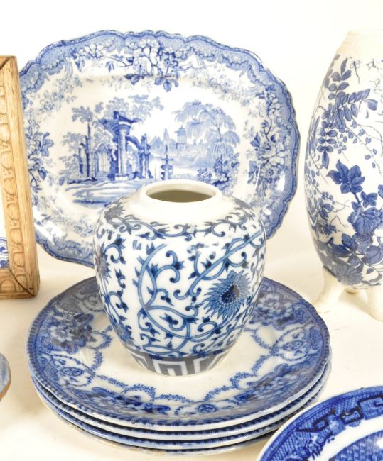 Collection of 19th / 20th china and ironstone wares all decorated in a blue and white transfer design. Makers including Miles Mason, Grimwades Atlas China, Royal Doulton, Wood & Sons, and more unmarked. Examples feature a tureen, plates, vases, serving trays, tile and more.