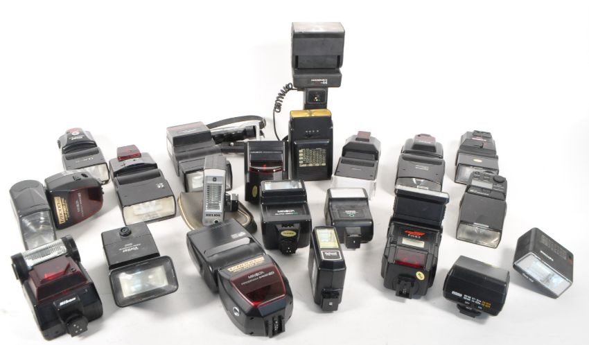 A collection of vintage 20th century camera photo flashes lights. Manufacturers including Sunpak, Nikon, Minolta, Hanimex, Vivitar, Cobra, Canton etc.