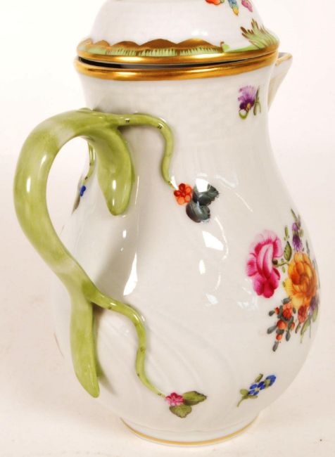 Herend, Hungary - Vintage porcelain lidded chocolate pot together with lidded twin handled cup with saucer. Marker's mark and BHR initial to underside. Hand painted floral design with flower finial and gilt rims.