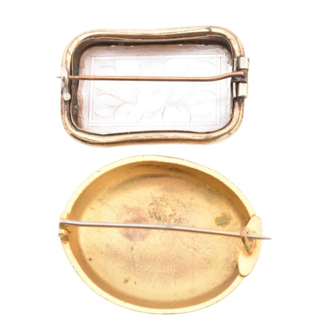 Two 19th century brooch pins and an agate mounted stick pin. The stick pin is surmounted with a banded agate plaque. The brooches to include a foliate, etched decorated mother of pearl plaque, together with a floral enamel decorated brooch pin in gilt metal. The stick pin unmarked tests indicate gold.