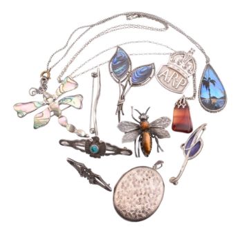 A collection of silver white metal jewellery. The jewellery to include a hallmarked silver locket pendant, A white metal tigers eye set bug brooch, a hallmarked WWII ARP button hole badge - Air Raid Precautions, silver enamel art nouveau style brooch pin, silver abalone brooch pin, A white metal abalone dragonfly brooch pin, a thunderbird pin, a white metal faceted bar brooch, a butterfly wing pendant necklace. An agate pendant necklace. Total weight 58.8g