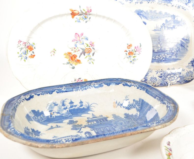 Collection of 19th century porcelain / ironstone serving platters. Comprised of a Coalport John Rose serving plate decorated in hand painted flowers on a white ground, a Spode oval shaped serving dish with floral decoration on a white ground, two unmarked rectangular deep serving dishes in a blue and white transfer design, a blue and white Willow pattern platter and an ironstone blue and white meat platter from 68 High St. Southampton China Bazaar. Largest piece measuring approx. 38cm x 31cm.