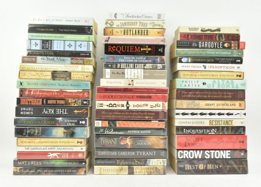 Advance reading proof copies. A collection of historical fiction, thrillers and fantasy titles. To include titles such as The Key by Simon Toyne, Requiem by Robyn Young, The Bellini Card by Jason Goodwin, This Thing of Darkness by Harry Thompson, The Secret Supper by Javier Sierra, The Mathematics of Love by Emma Darwin, The Carhullan Army by Sara Hall, The Great Stink by Cassandra Clark, The Fool's Crusade by Pip Vaughan-Hughes, The Geographer's Library by Jon Fasman, The Peoples Act of Love by James Meek, Pelagia and the White Bulldog by Boris Akunin, Zugzwang by Ronan Bennett, The Panopticon by Jenni Fagan, The Historian by Elizabeth Kostova, The Thief Taker's Apprentice by Stephen Deas, The Best of Men by Claire Letemendia, Crow Stone by Jenni Mills, Red Seas under Red Skies by Scott Lynch, The Inquisition by Alfredo Colitto, Resistance by Owen Sheers, Crusade by Elizabeth Laird, Altar of Bones by Philip Carter, The Gargoyle by Andrew Davidson, The Snake Stone by Jason Goodwin and The Thirteenth Tale by Diane Setterfield, among others. Publisher's wraps, some minor shelfwear & occ. bumping or fold damage, else an excellent collection. Approx. fifty-three titles. 8vo. (2 boxes)