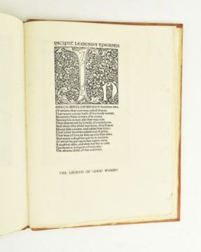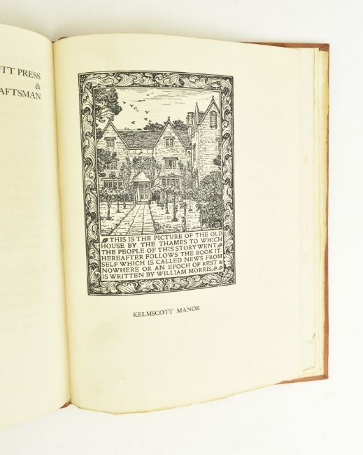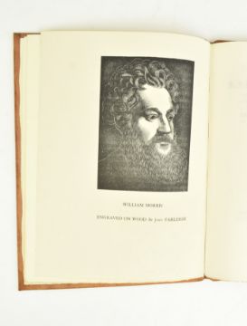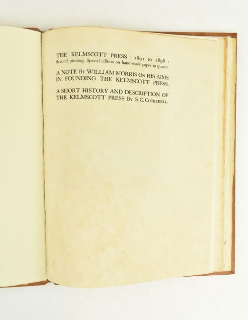 Kelmscott Press interest. 1934 The Kelmscott Press: 1891-1898: A Note by William Morris on his Aims in Founding the Kelmscott Press, together with A Short History and Description of the Kelmscott Press by S. C. Cockerell, reprinted for Philobiblon to Celebrate the Centenary of the Birth of William Morris. Large paper edition, extra illustrated with a leaf of Kelmscott printing. London: London County Council Central School of Arts and Crafts. Bound with colophon, being line blocks from The Kelmscott Press: Kelmscott Manor, The Golden Type, The Legend of Good Women, Title Page, The Dream of John Ball, The Troy Type, The Chaucer Type, and the final leaf with Kelmscott William Morris Colophon tipped in. Complete with engraved portrait of Morris by John Farleigh. Second printing. Special edition on handmade paper in quarto. Full tan morocco boards, a few marks & scratches to boards, extremities a little bumped, edges uncut, some handling marks & wear to the final leaves demonstrating the Kelmscott typeface, else a lavish 1930s work recalling the splendour & craftsmanship of the Kelmscott Press. 4to. (1)