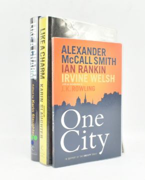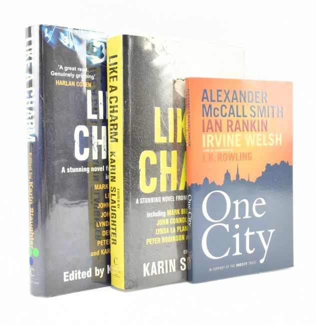 Crime & thriller short story collections. Three multi signed anthologies. Comprising 2004 Like a Charm ed. Karin Slaughter, signed by Slaughter, Mark Billingham, John Harvey, Denise MIna, John Connolly & another; a proof copy of the same signed by John Connolly, Peter Moore Smith, and Karin Slaughter; and 2005 One City intro. J. K. Rowling, three short stories by Alexander McCall Smith, Ian Rankin and Irvine Welsh, signed by all three authors. Publisher's wraps / hardback in dust wrapper with Mylar protective sleeve, an excellent collection. 8vo. (3)