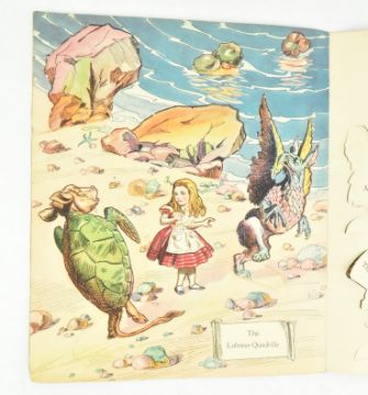 Moveable children's picture books:- Carroll, Lewis (pseud. Charles Lutwidge Dodgson) & Sage, Sidney (illus.). 1934 Stand-ups Adventures of Alice in Wonderland. No. 964. Ohio: The Saalfield Publishing Co. Patent Applied For. Six pages of pop up illustrations, all unused. Publisher's paper wraps, minor edgewear to extremities, stapled spine worn, internally smart with popups intact throughout. A charming 1930s interactive interpretation of Carroll's classic children's fantasy. Folio. (1)