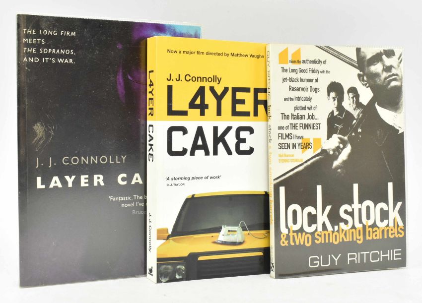 Thrillers:- Connolly, J. J. & Ritchie, Guy. 2000 Layer Cake. Signed first edition together with unsigned proof copy of the same, together with 1998 Lock, Stock & Two Smoking Barrels by Guy Ritchie, first edition. Publisher's wraps, two in protective covers, minor shelfwear, else smart. The two works behind two iconic early noughties action movies, one directed by Matthew Vaughan, the other Guy Ritchie. 8vo. (3)
