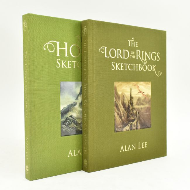 Tolkien, John Ronald Reuel & Lee, Alan (illus). 2019 The Hobbit and The Lord of the Rings Sketchbooks. Signed de luxe limited edition boxed set, this out of sequence & marked U U of 3,000. Signed by Lee to limitations page of The Hobbit. Two volumes, housed in pictorial illustrated slipcase, each lavishly illustrated with Lee's sketches of Middle-earth and Tolkien's beloved characters and scenery; near fine with just the lightest shelfwear to case & pictorial inset on covers of books. A beautiful signed limited edition showing the behind the scenes of Lee's reimagining of Tolkien's beloved legendarium. 4to. (2vol)