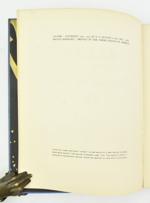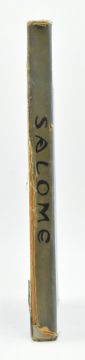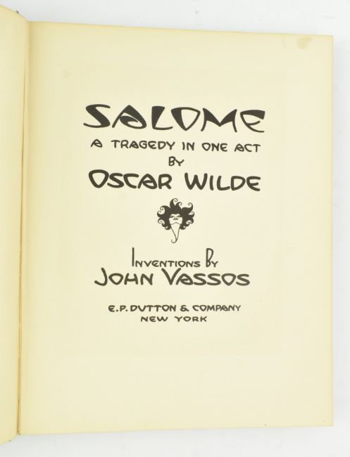 Wilde, Oscar. 1930 Salome, a Tragedy in One Act. Inventions by John Vassos. New York: E. P. Dutton & Company. Publisher's blue cloth, spine significantly discoloured & loosening from textblock, with loss to the head & tail, boards a touch scratched and extremities bumped, minor age-toning to margins internally, else smart. Beautifully illustrated with black and white Art Deco illustrations after Vassos. A desirable edition of Wilde's play. 4to. (1)