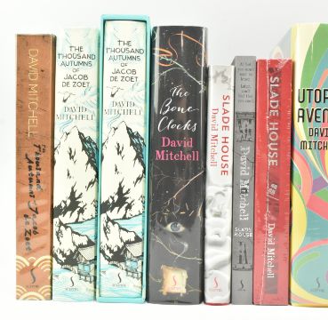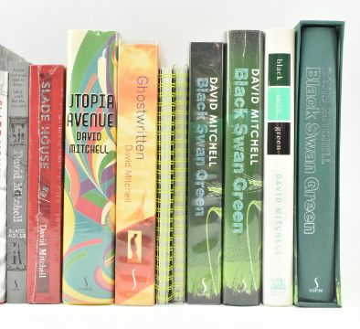 Mitchell, David. A collection of fifteen signed first editions & limited editions. Comprising 1999 Ghostwritten, first edition; 2010 The Thousand Autumns of Jacob de Zoet, signed proof copy, signed dated & lined first edition & signed limited edition; 2015 Slade House, signed first edition, signed proof copy, and signed and numbered limited edition still in shrinkwrap; 2014 The Bone Clocks, signed, squiggled & dated first edition; 2020 Utopia Avenue, signed limited edition this No. 427 of 1000; and 2006 Black Swan Green, two promotional diaries, advance proof copy, signed first UK edition & signed first US edition, and signed limited edition in slipcase, this No. 617 of 1000. Publisher's boards, those issued with dust wrappers in Mylar protective sleeves, near fine with just light shelfwear. 8vo. (15)