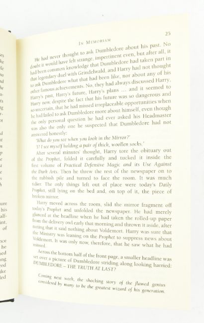 Rowling, J. K. A collection of seven works from the Harry Potter series, including three first editions. Comprising a 1998 16th impression of the Philosopher's Stone in paperback adult cover, a 1998 10th impression of the Chamber of Secrets in paperback adult cover, a 1999 Prisoner of Azkaban 10th impression paperback, a 2000 Goblet of Fire first impression paperback, a 2003 Order of the Phoenix first impression hardback in dust wrapper, a 2005 Half Blood Prince first impression in dust wrapper, and a 2007 Deathly Hallows first edition in adult covers, complete with Wizarding World bookmark. Publisher's wraps / hardbacks in dust wrappers, no prior ownership inscriptions, minor signs of having been read noticeably to paperbacks, otherwise a very smart collection. 8vo. (7)