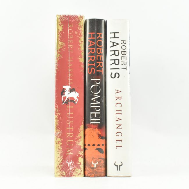Thrillers:- Harris, Robert. Three first editions. Comprising 1998 Archangel, first edition, first impression; 2003 Pompeii, first edition, first impression; and Lustrum, limited edition in slipcase & orig. shrinkwrap. Publisher's boards, those in dust wrappers with Mylar protective sleeves, minor handling marks and age-toning, else a smart collection. 8vo. (3)